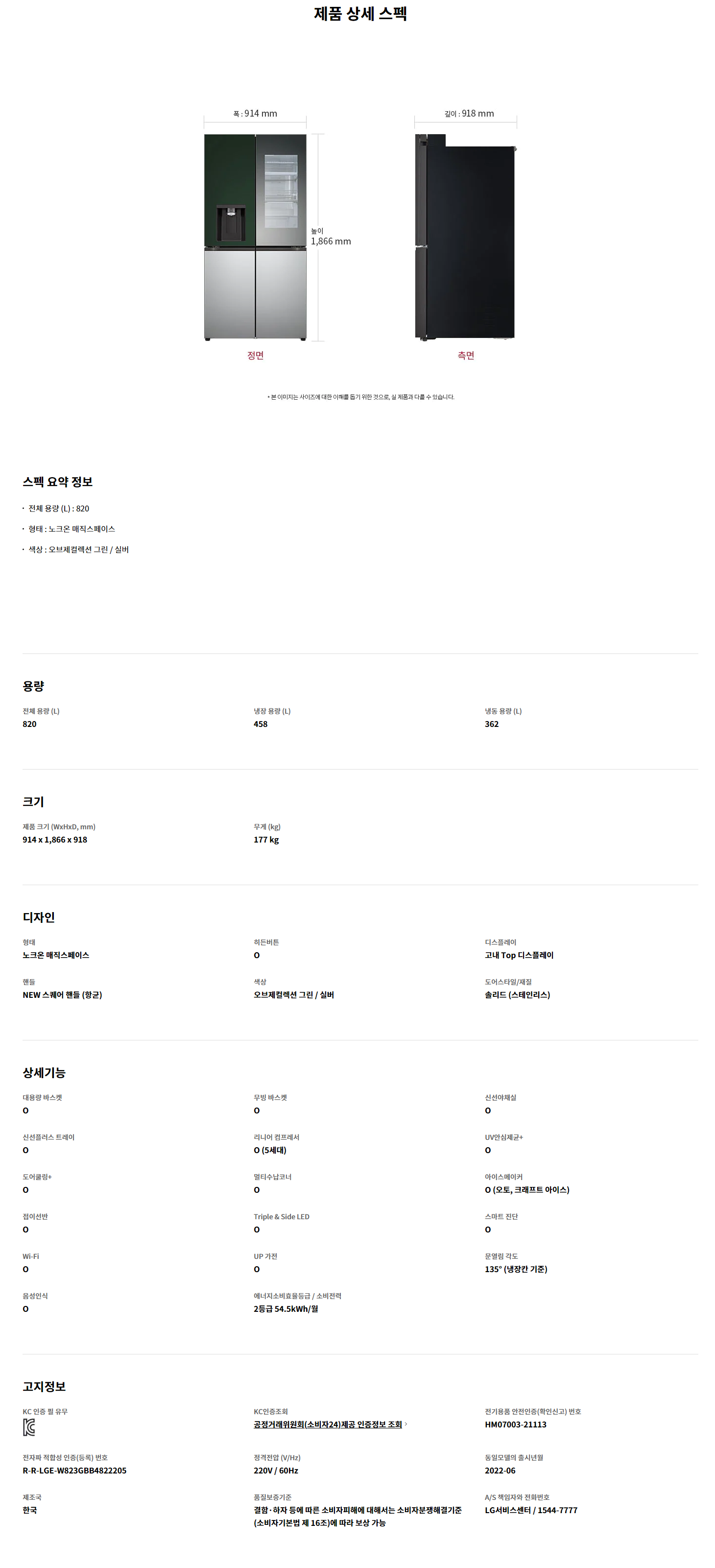 총용량 : 820 ℓ (냉동 362 / 냉장 458)