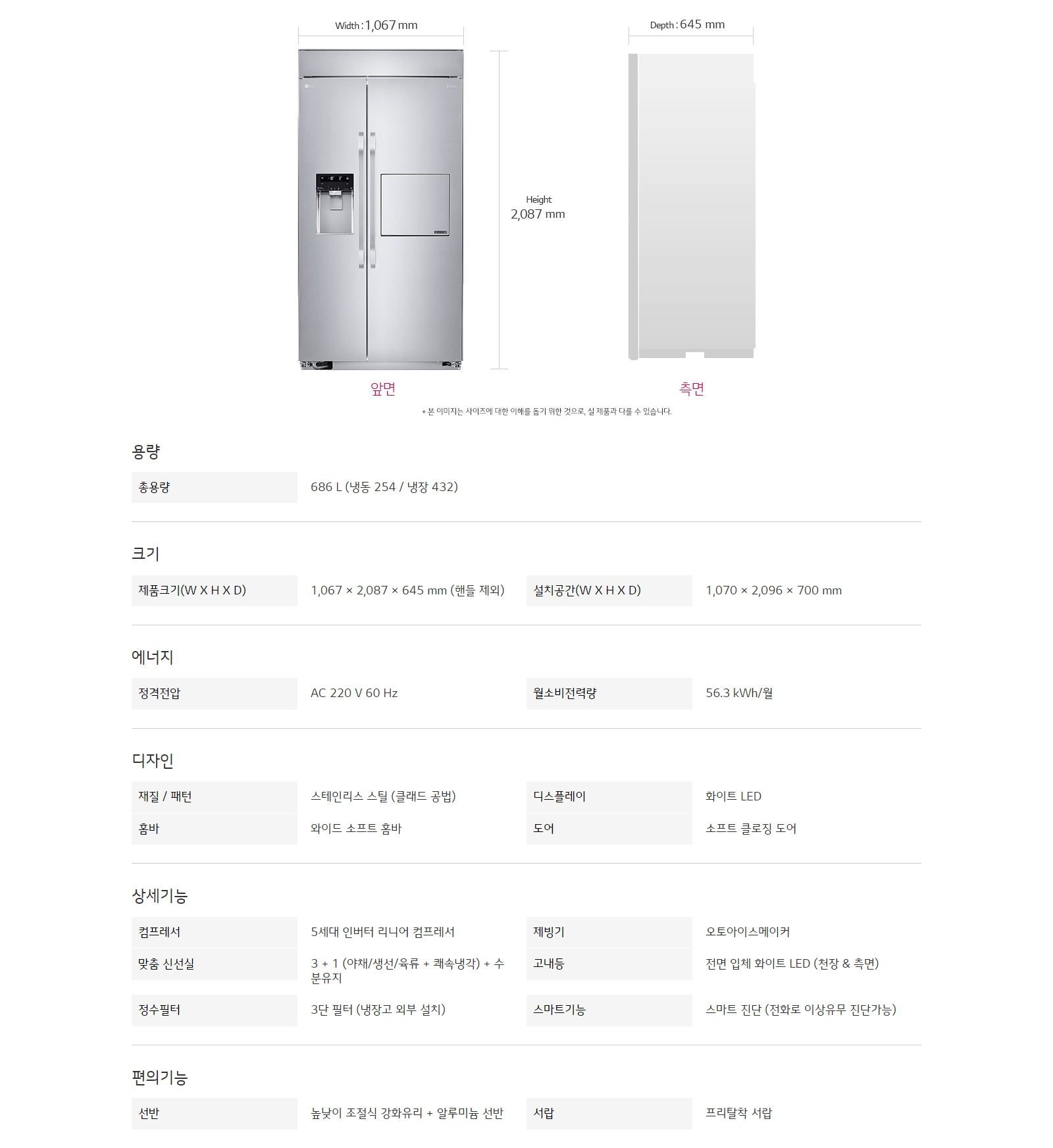 총용량 : 686 ℓ (냉동 254 / 냉장 432)