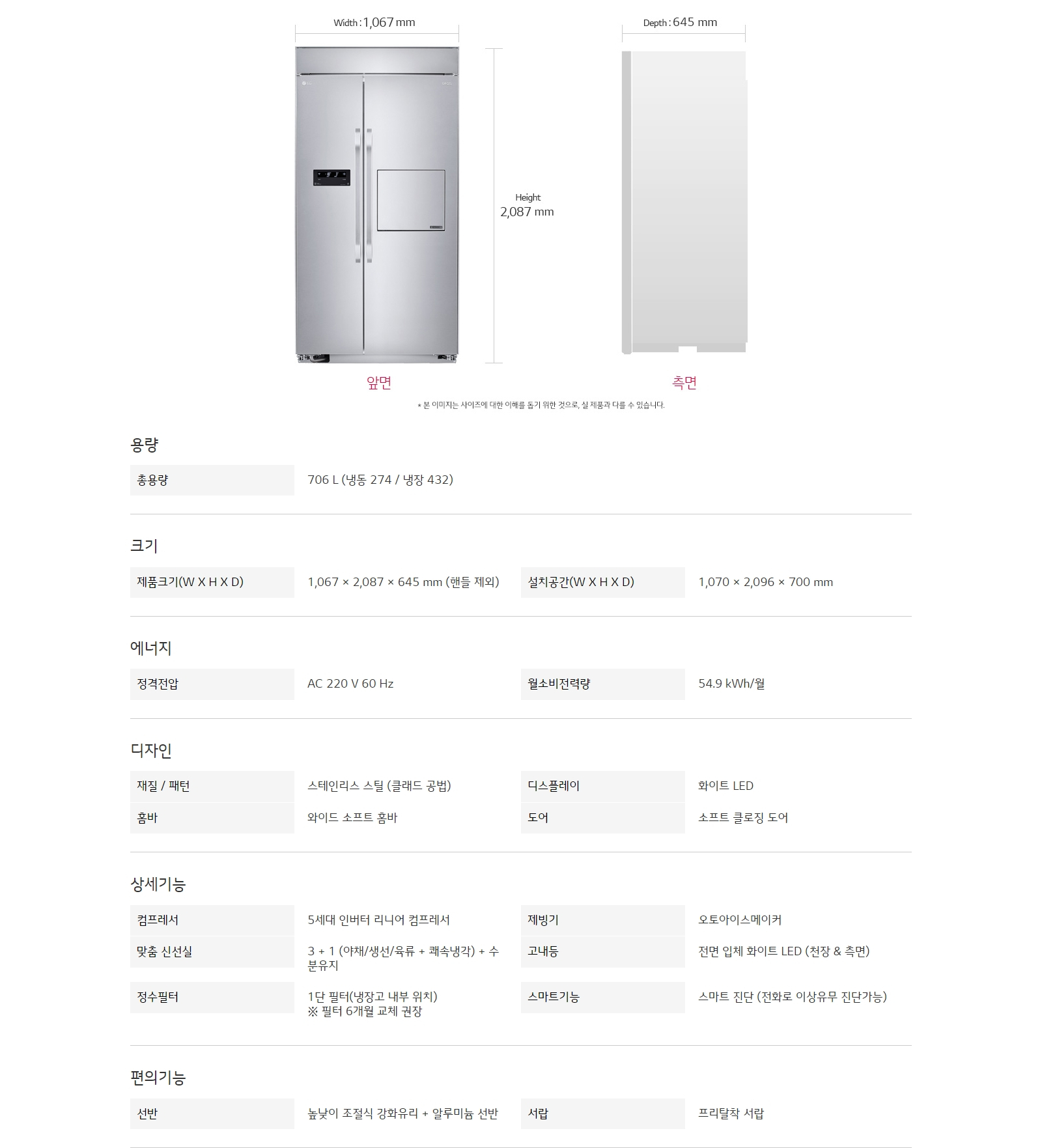 총용량 : 706 ℓ (냉동 274 / 냉장 432)