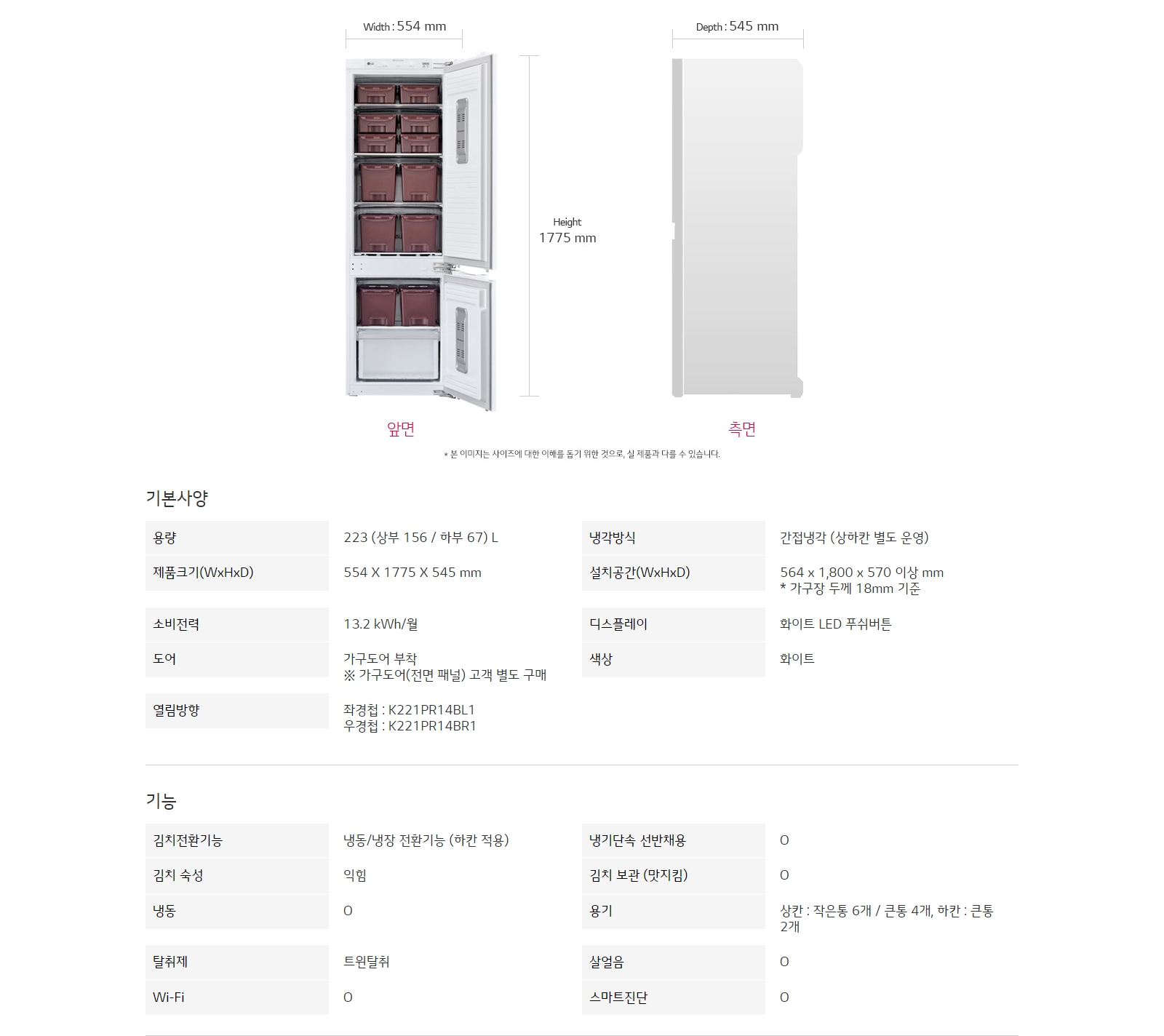 총용량 : 223 ℓ (상부 156/하부 67)