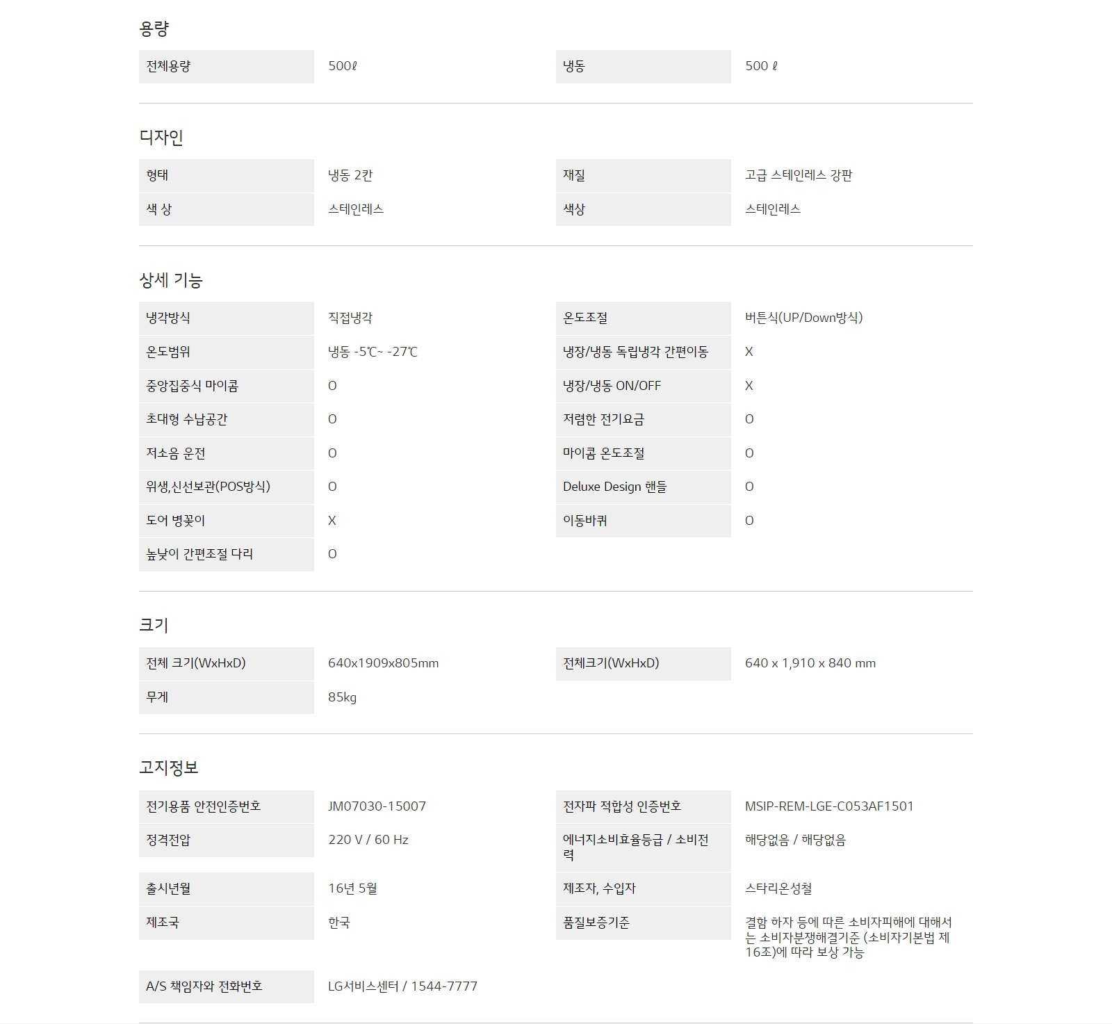 제품크기(W×H×D) : 640×1,910×840 ㎜