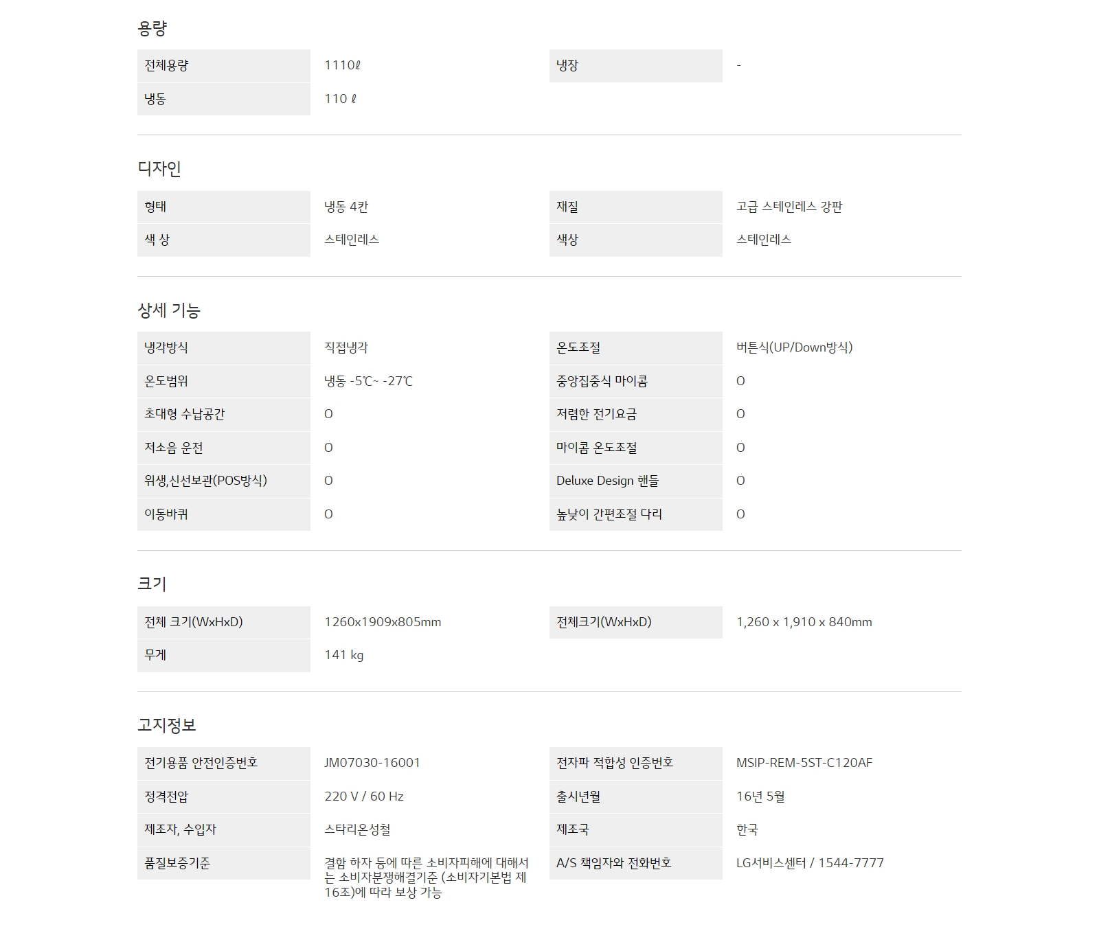 총용량 : 1,110 ℓ ( 냉동 1,110)