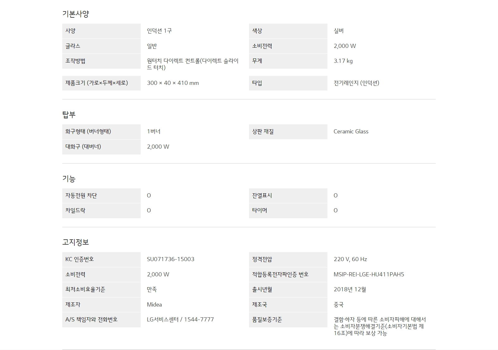 사양 : 인덕션 1구