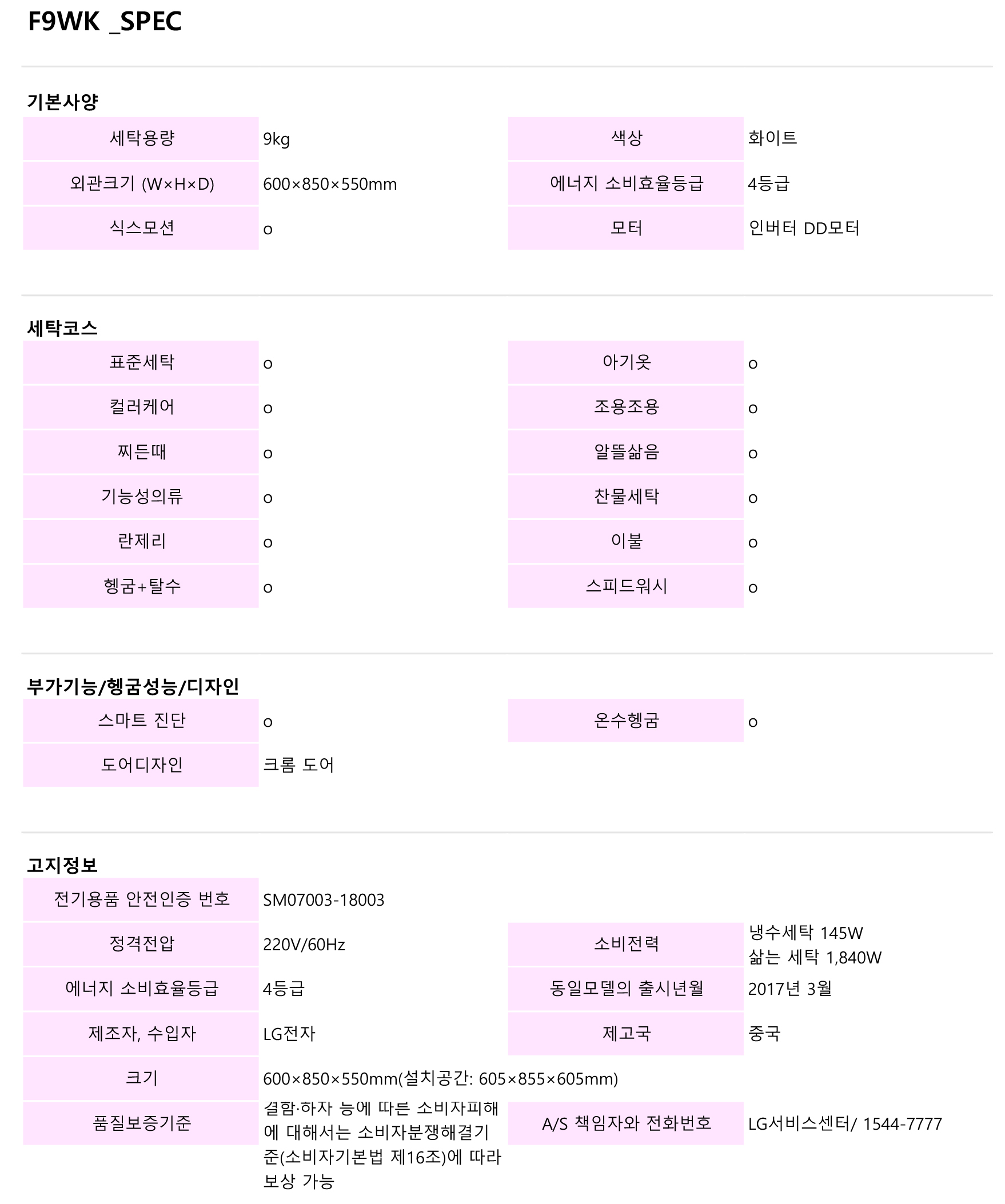 세탁용량 : 9 ㎏