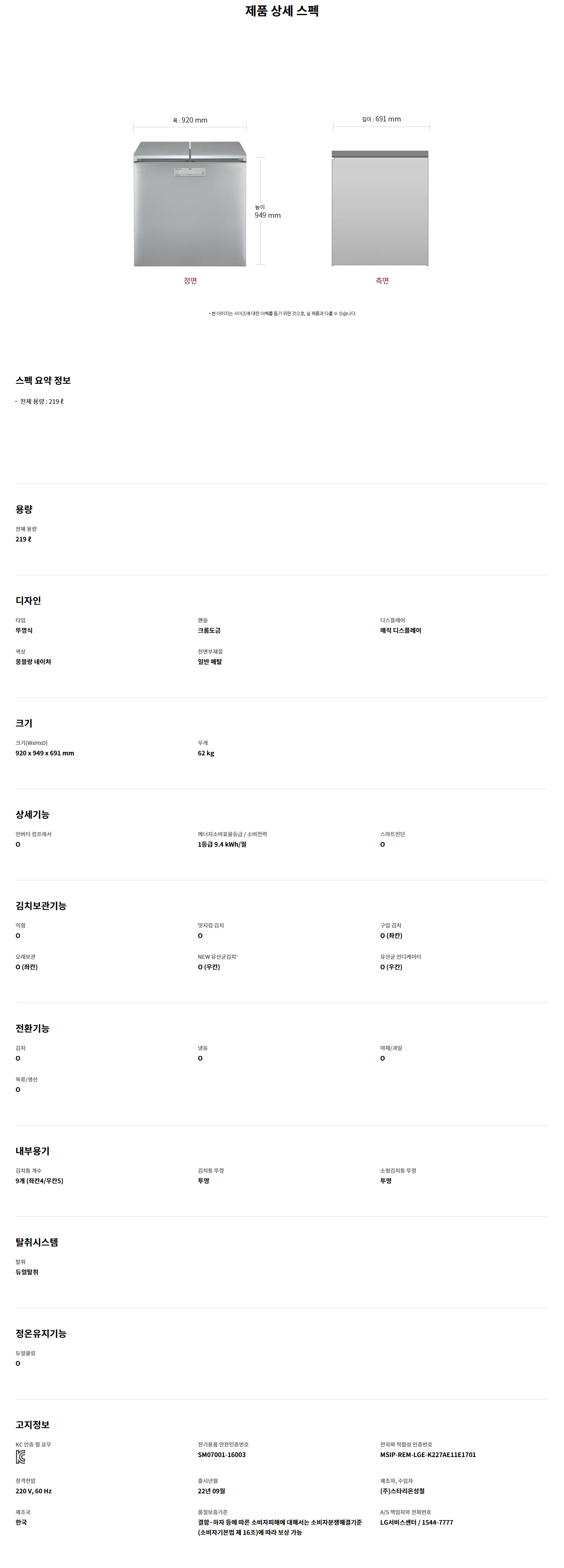 전체용량 : 219ℓ