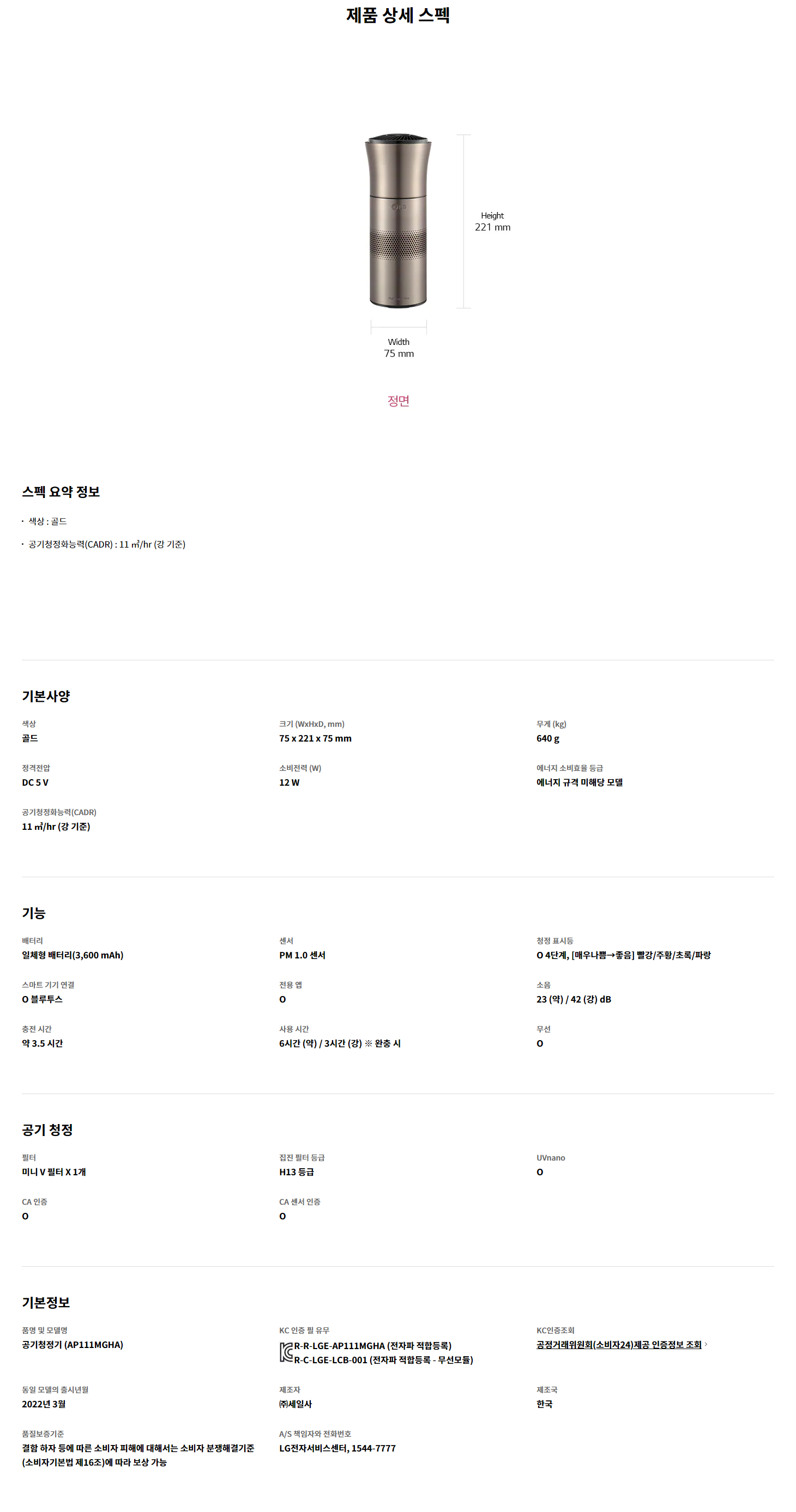 공기청정화능력(CADR) : 11 ㎥/hr (강 기준)