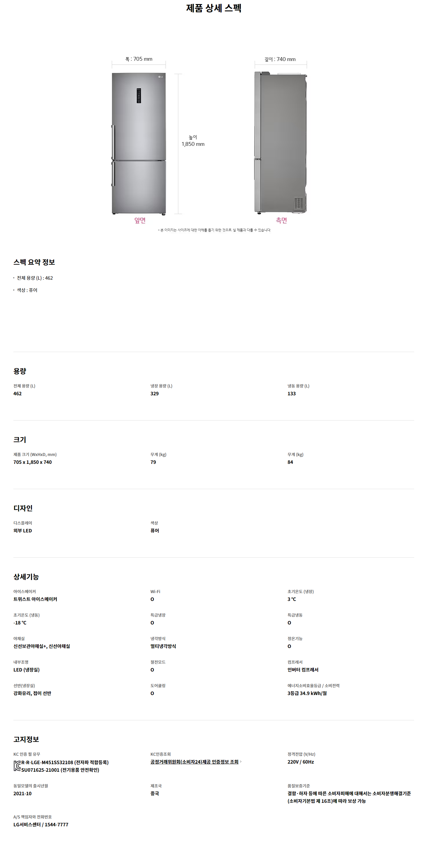 총용량 : 462 ℓ (냉동 133 / 냉장 329)