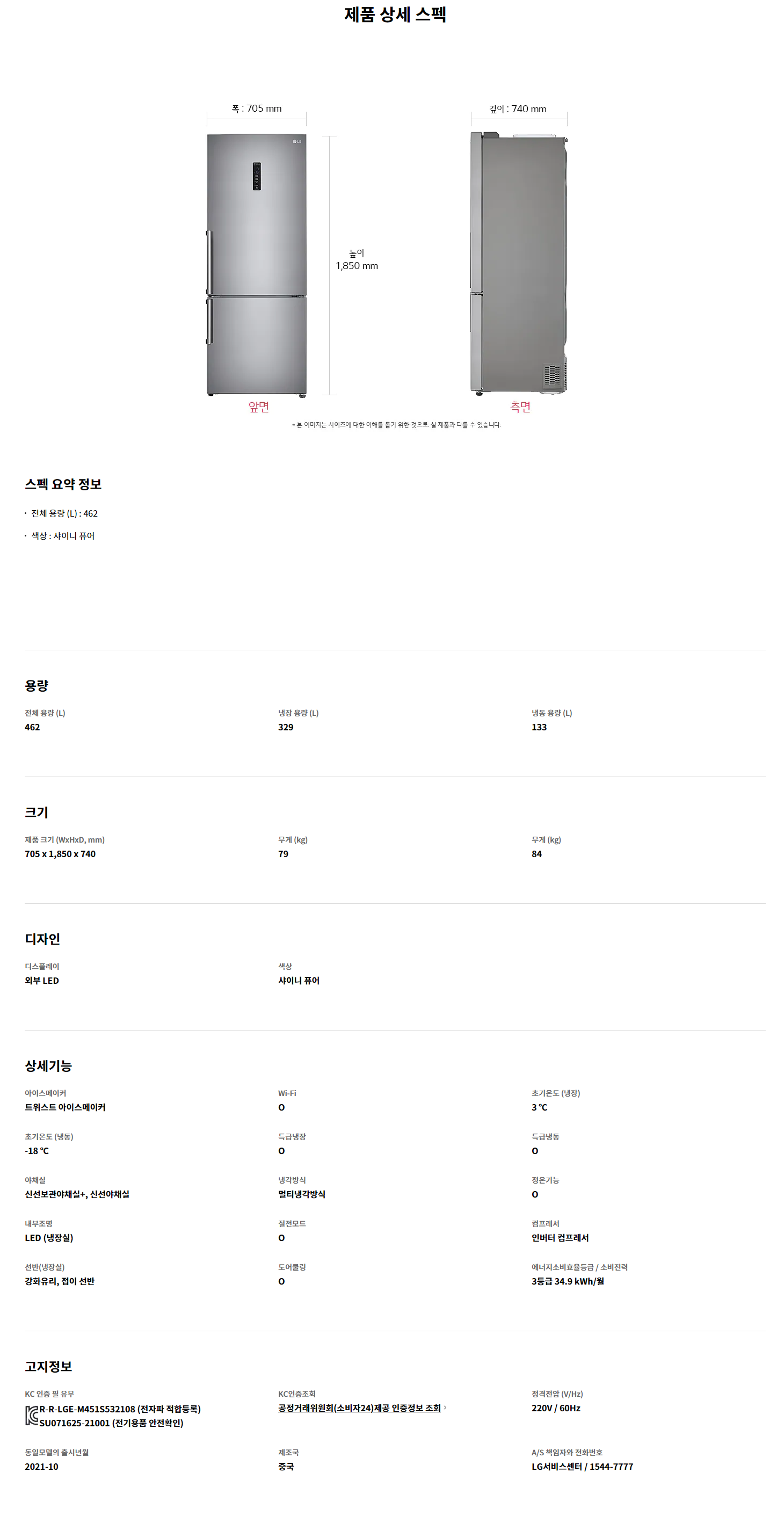 총용량 : 462 ℓ (냉동 133 / 냉장 329)